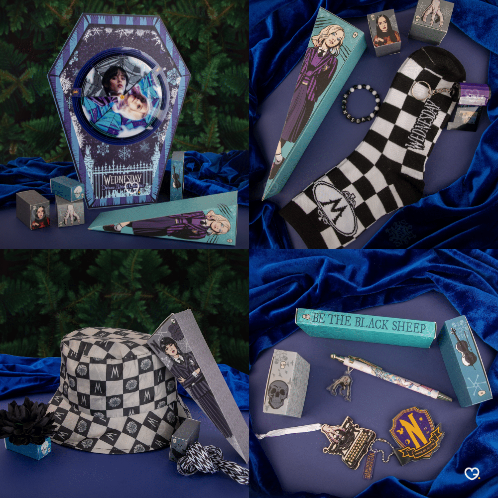 • ⚰️ Packaging luxueux en forme de cercueil lenticulaire reflétant l'esthétique gothique de Wednesday